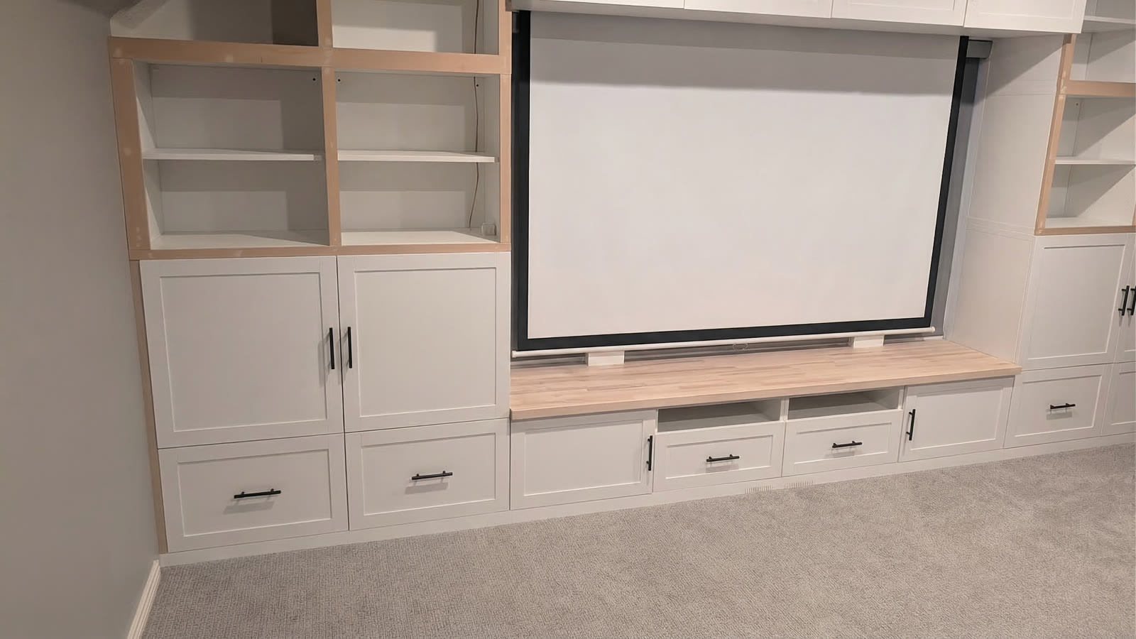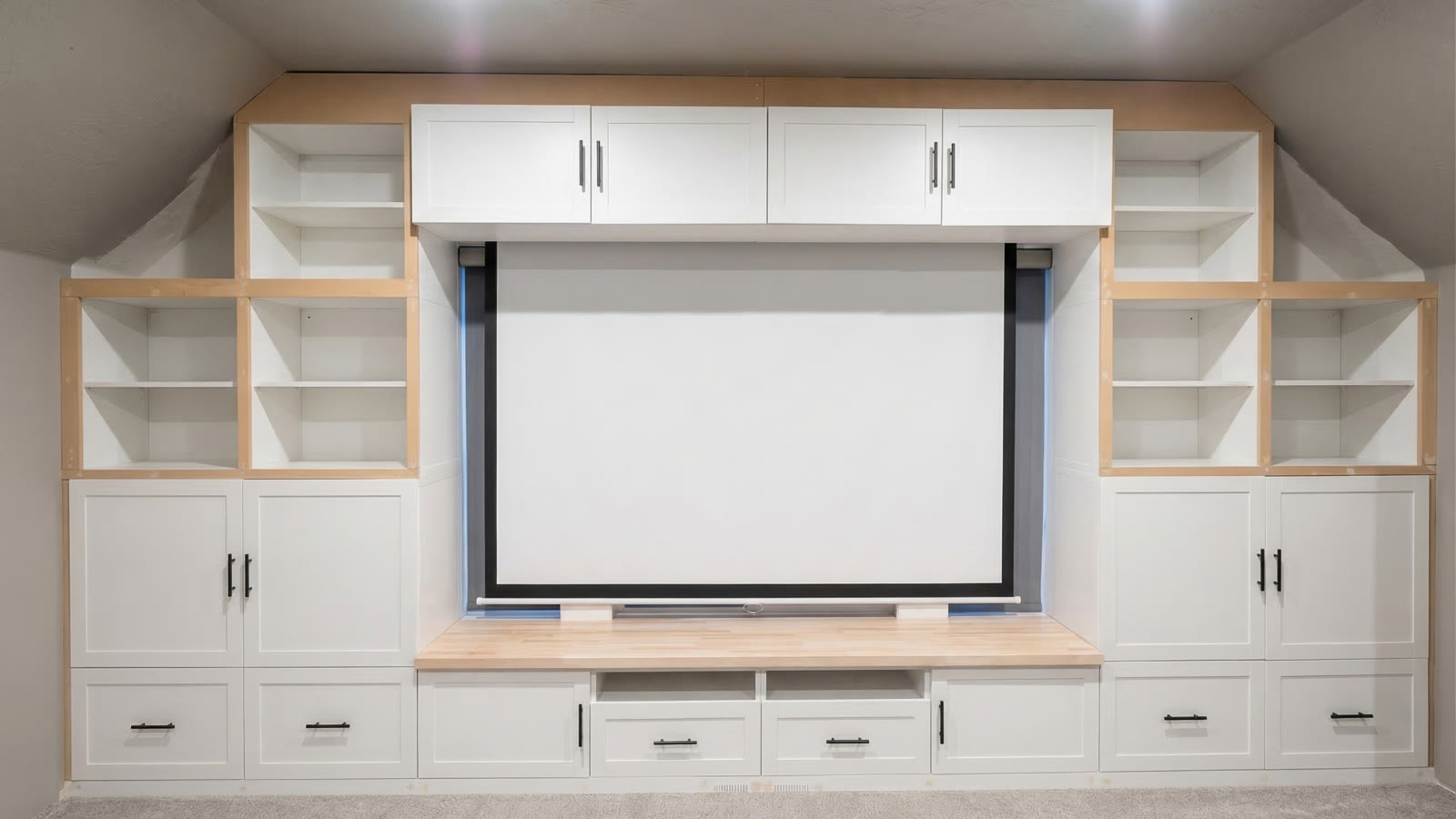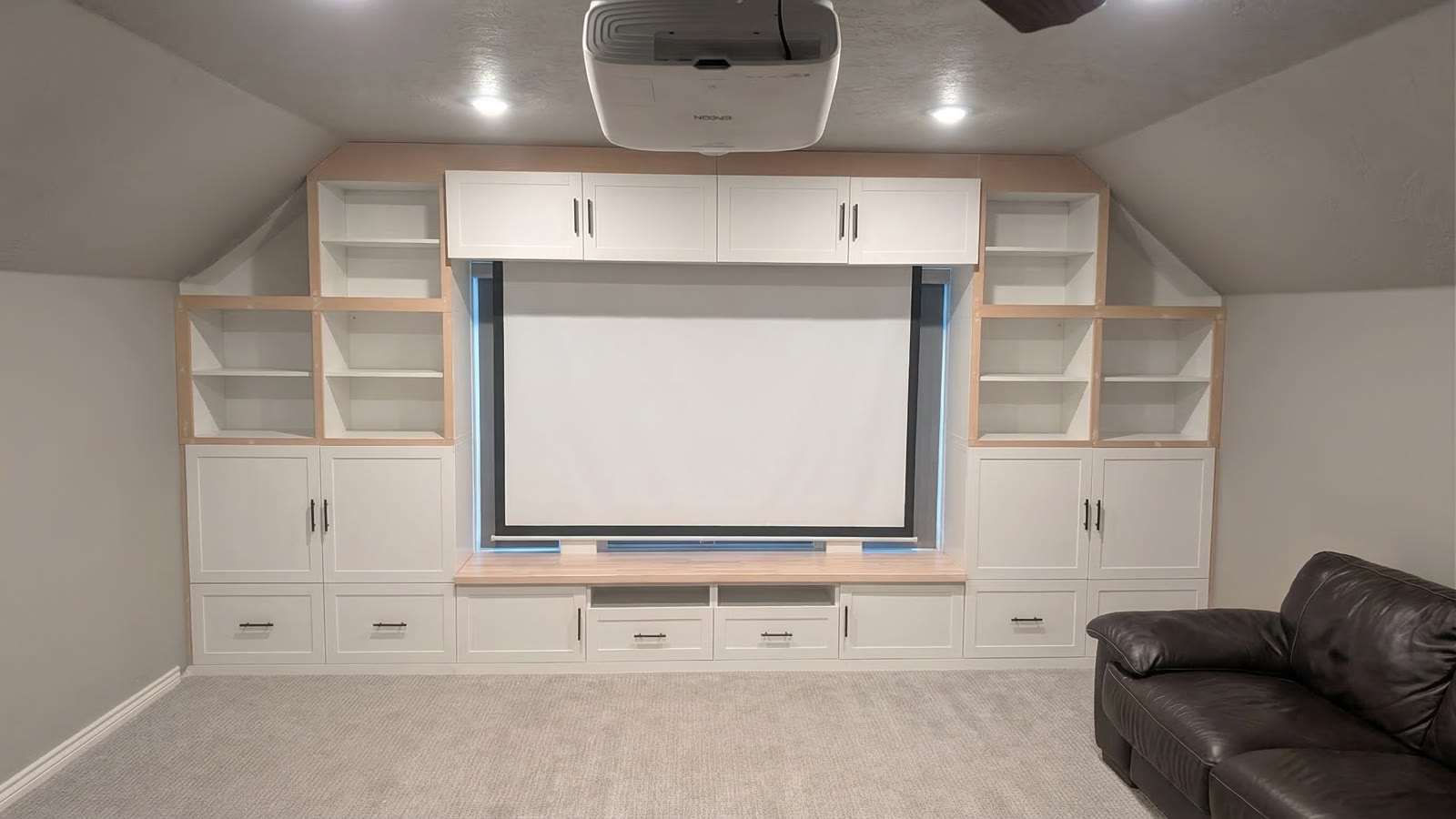Unit was partially DIY-built and needs professional finishing. Face frames are the primary unfinished item. Scribe work at the angled ceiling will require precision cuts. Projector (Epson, ceiling-mounted) must be protected โ do not disturb mount or alignment.