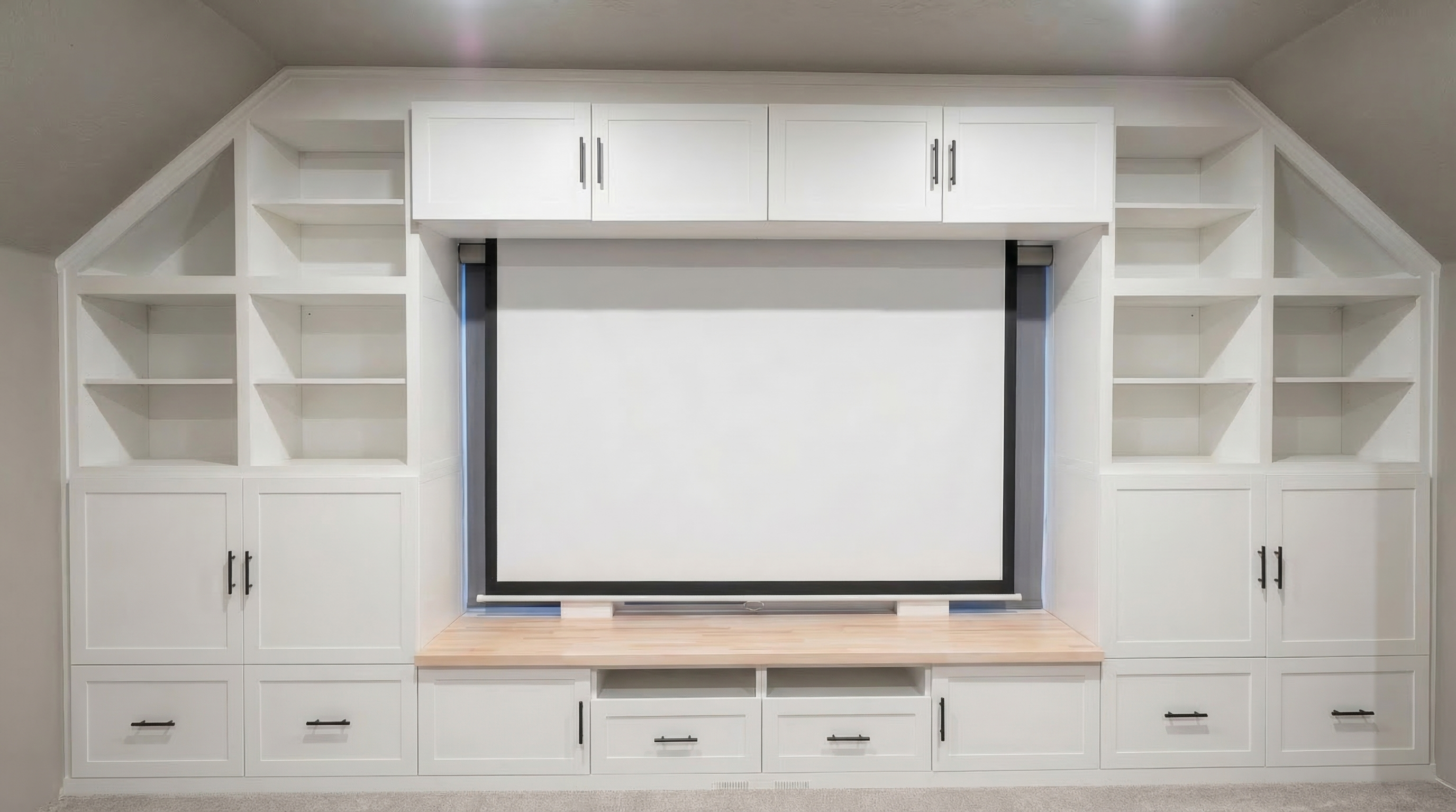 Built-in unit is substantially constructed. White Shaker cabinet doors/drawers with matte black bar pulls installed. Finger-jointed hardwood butcher block countertop runs full center width. Motorized drop-down projector screen integrated into upper cabinet housing. Epson ceiling-mounted projector in place. Raw pine/poplar face frames throughout open shelving sections โ unfinished, nail holes and wood filler visible, need sanding and painting. Visible gaps at ceiling angle transitions need scribe trim or caulk. Vaulted ceiling with ~45ยฐ slopes both sides. Ceiling height ~8.5โ9ft at peak, ~4โ4.5ft at knee walls. Light gray carpet flooring, good condition. No windows. At least one electrical outlet in left shelf section.