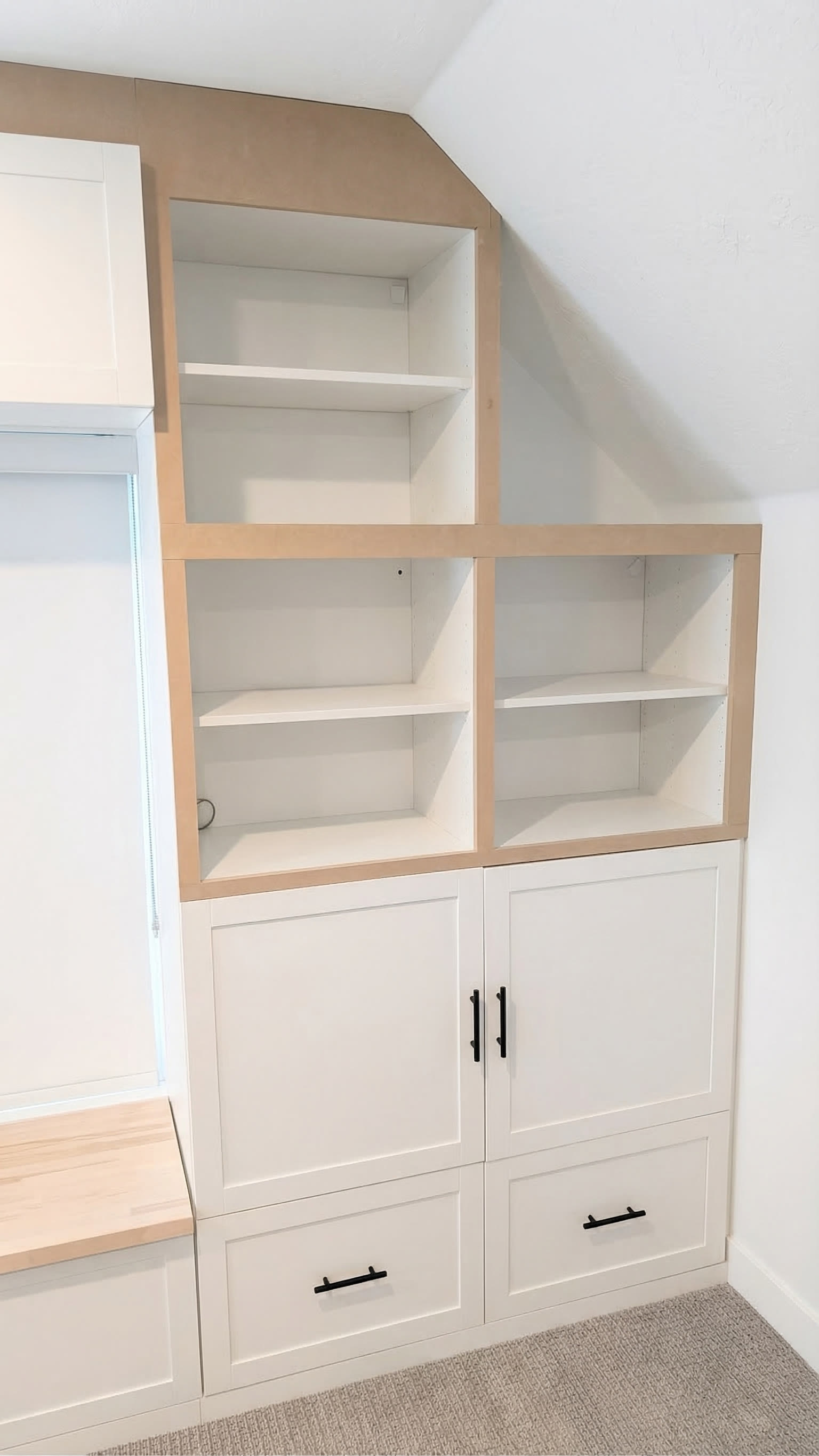 Custom built-in shelving and cabinets in bonus room media space. Unit substantially built โ contractor needed to finish face frames, paint all raw wood white to match existing cabinetry, fill all holes and gaps, add scribe/trim pieces at ceiling angles on both upper corners, caulk all gaps, and remove triangular corner cabinet doors to create open shelving consistent with surrounding cubby spaces.